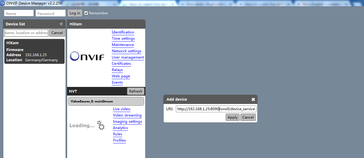 Wenn nicht, fügen Sie die Kamera bitte manuell hinzu, indem Sie auf „Add“ unten links klicken. Tragen Sie http://IP-Adresse der Kamera:8090/onvif/device_service ins Fenster ein.