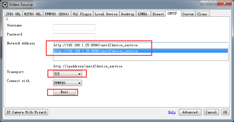 Schritt 5: Im Popup-Fenster sollten Eintragsmöglichkeiten für die gefundene(n) Kamera(s) erscheinen. Ändern Sie Transport zu TCP, prüfen Sie, dass bei Verbinden mit FFMPEG eingestellt ist, klicken sie dann auf Weiter .